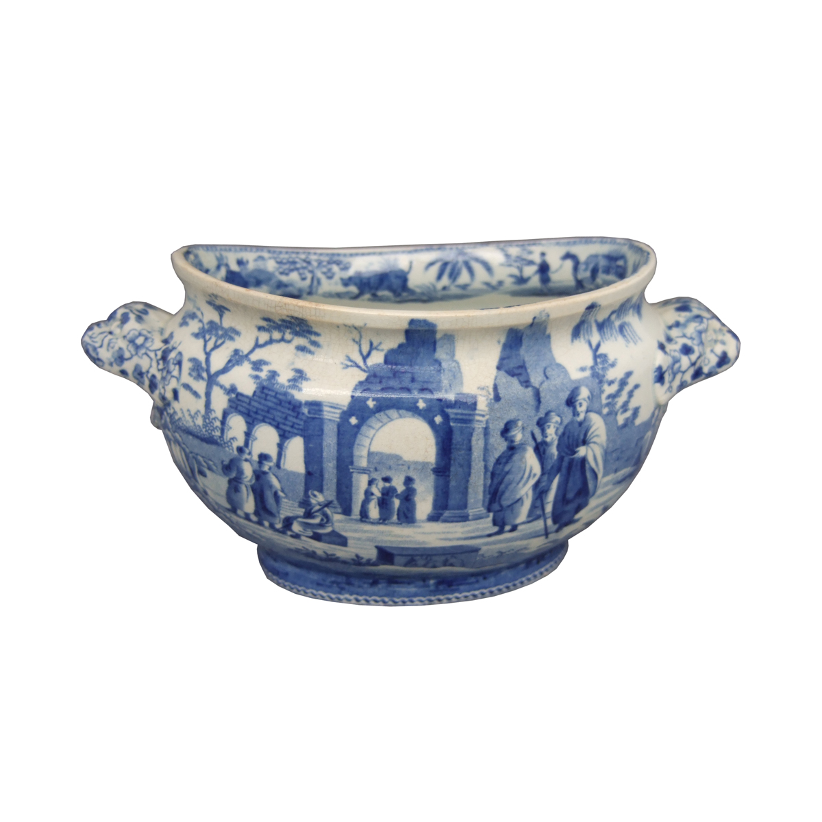 Shown on an earthenware sauce tureen printed in blue underglaze. The source print has the same title as the pattern. See below an image of the related sauce tureen stand, printed with the pattern "Necropolis or Cemetery of Cacamo", as well as an image of the assembled tureen. The lid is printed with a section of the border pattern. Click on the images to enlarge them.   Drakard/Holdway Pattern Number P905-15 Mark Types and IDsImpressed 3a Workman's Mark Transfer Printed WMT 1