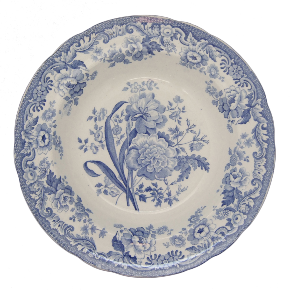 This example of the second pattern in Spode's British Flowers series is exhibited on an earthenware soup plate in blue underglaze. Drakard/Holdway Pattern Number P902-2 Mark Types and IDsImpressed 4 Transfer Printed 33 Green Workman's Mark Transfer Printed WMT unidentified mark 2