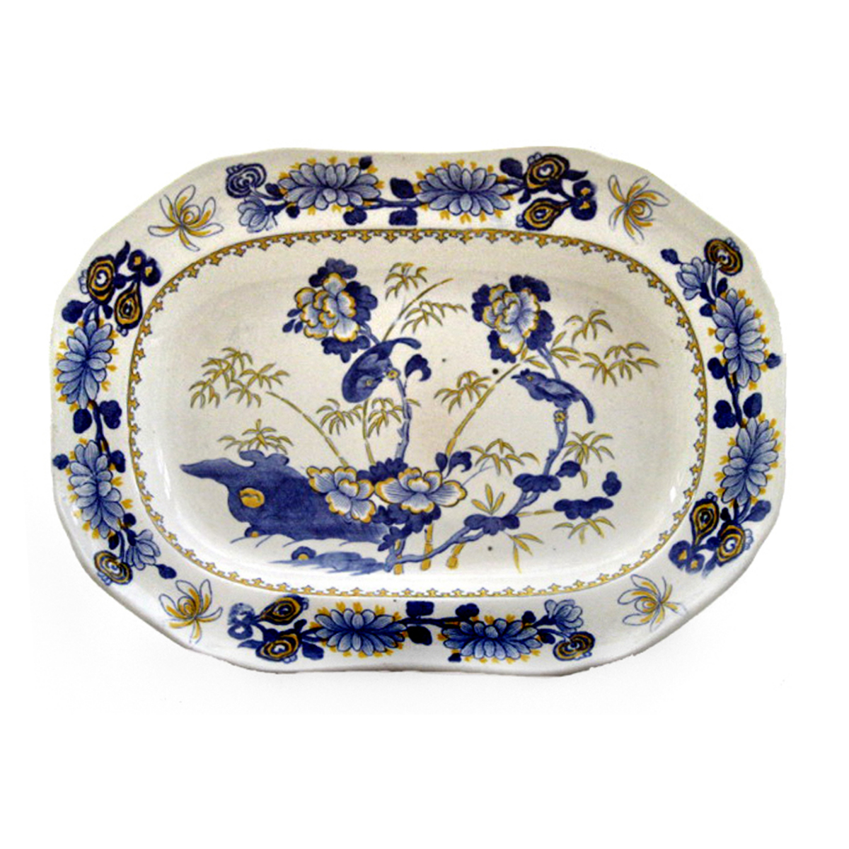 Shown is an earthenware platter printed in blue and colored in underglaze. The pattern is recorded in Spode's B Pattern Book as number 98. It is known to have been used on dinnerware and also produced on stone china. Mark Types and IDsTransfer Printed 33