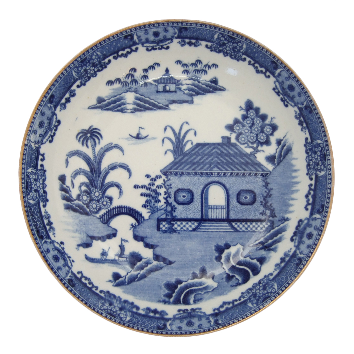 This very rare pattern is known only on bone china. It is shown here on a round saucer printed in blue underglaze with a gilt decoration on the rim. Attribution is made based on a marked bone china cream jug with impressed SPODE. It is c. 1800-1805. Drakard/Holdway Pattern Number P617