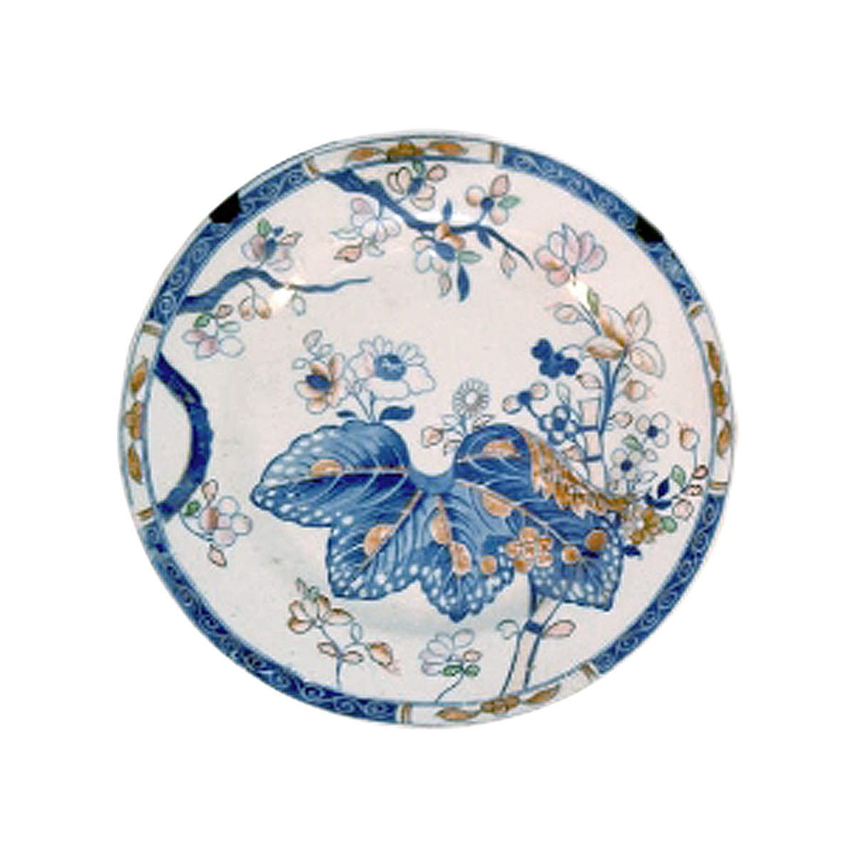 This pattern is exhibited here on a stone china plate. It was printed in blue and colored-in underglaze. There were a number of color variations produced in this pattern. It was also used on breakfast and tea wares.