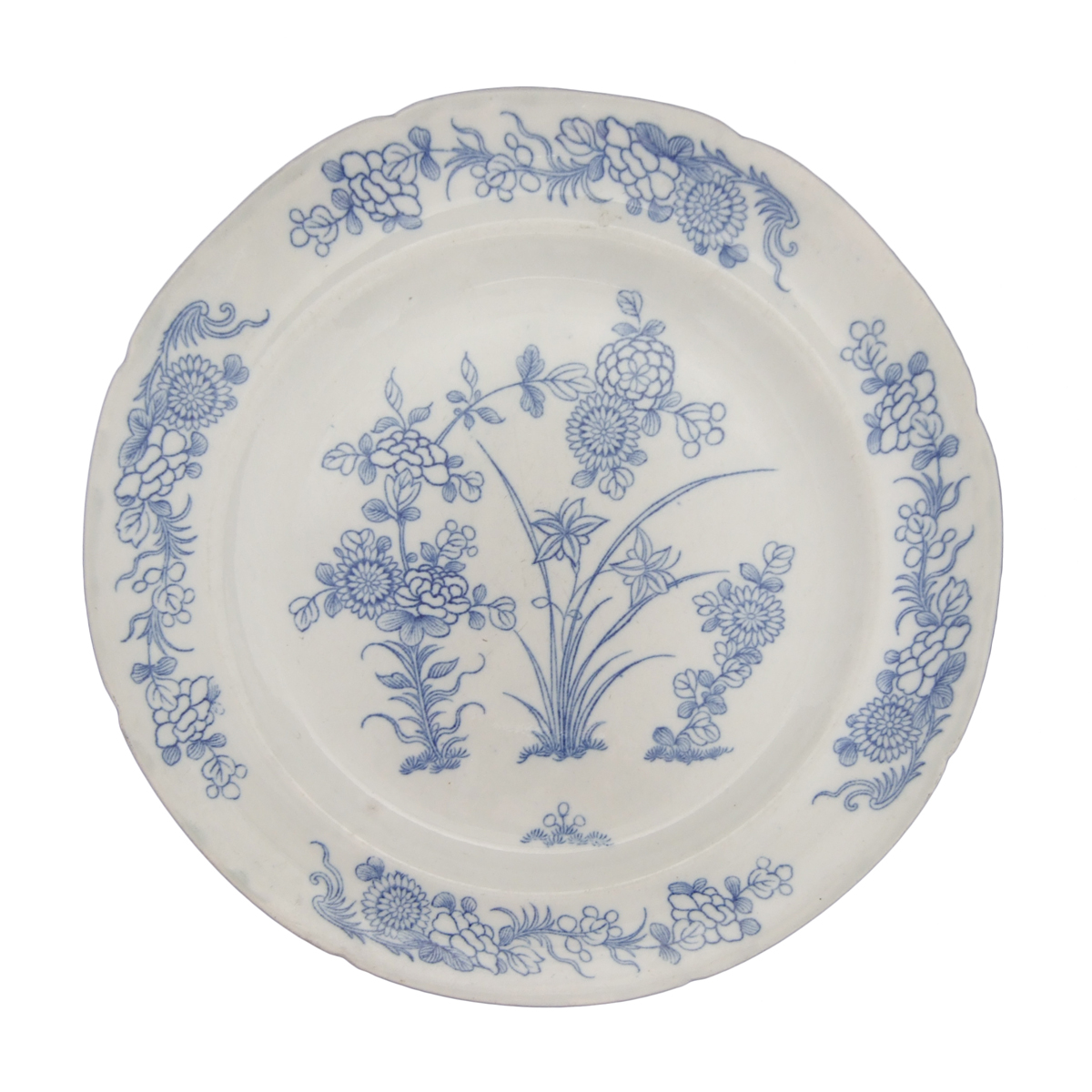 Exhibited on a New Indented earthenware dinner plate is Spode's Chinese Flowers pattern in blue underglaze. The flowers on the left and right are chrysanthemums. In the middle is a Chinese variety of orchid or hemerocallis (day lily). It is one of the few outline prints that were regularly issued in plain blue without added color. It probably dates from 1815. Drakard/Holdway Pattern Number P816 Mark Types and IDsImpressed 4 Workman's Mark Transfer Printed WMT 12