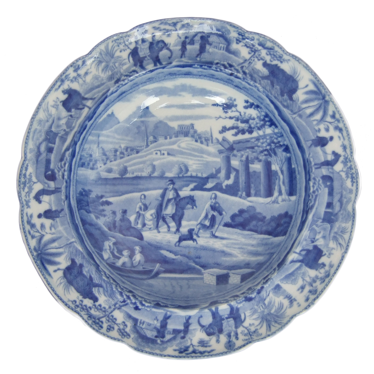 Shown on an earthenware soup plate printed in blue underglaze. The source print is "The City of Corinth". Drakard/Holdway Pattern Number P905-13 Mark Types and IDsImpressed 3a Workman's Mark Transfer Printed WMT 22