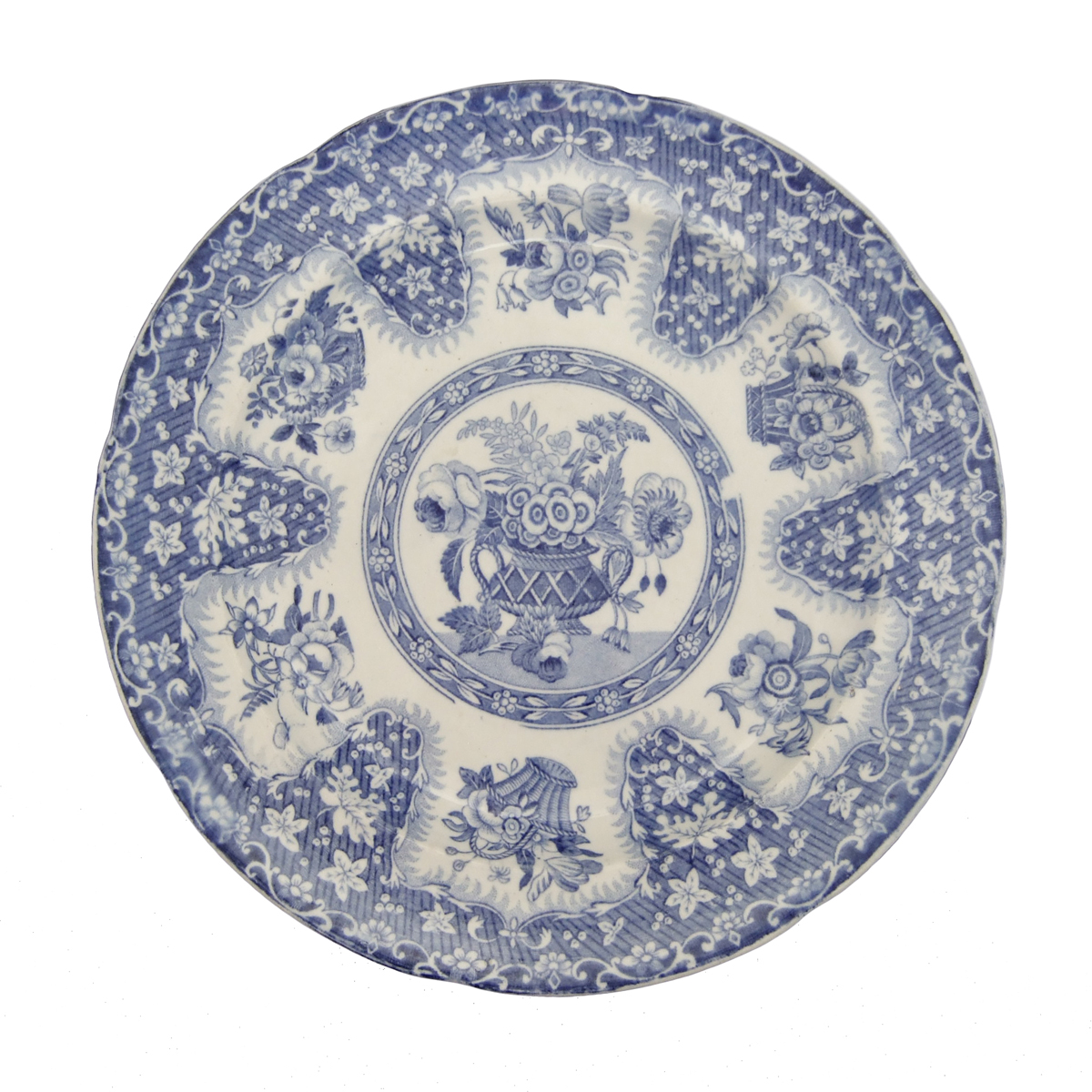 Exhibited on a Circular earthenware tea plate is Spode's Filigree pattern printed in blue underglaze. Thought to have originated around 1823, it was one of Spode's most popular patterns. Drakard/Holdway Pattern Number P818 Mark Types and IDsImpressed 4 Transfer Printed 33 Workman's Mark Transfer Printed WMT 11