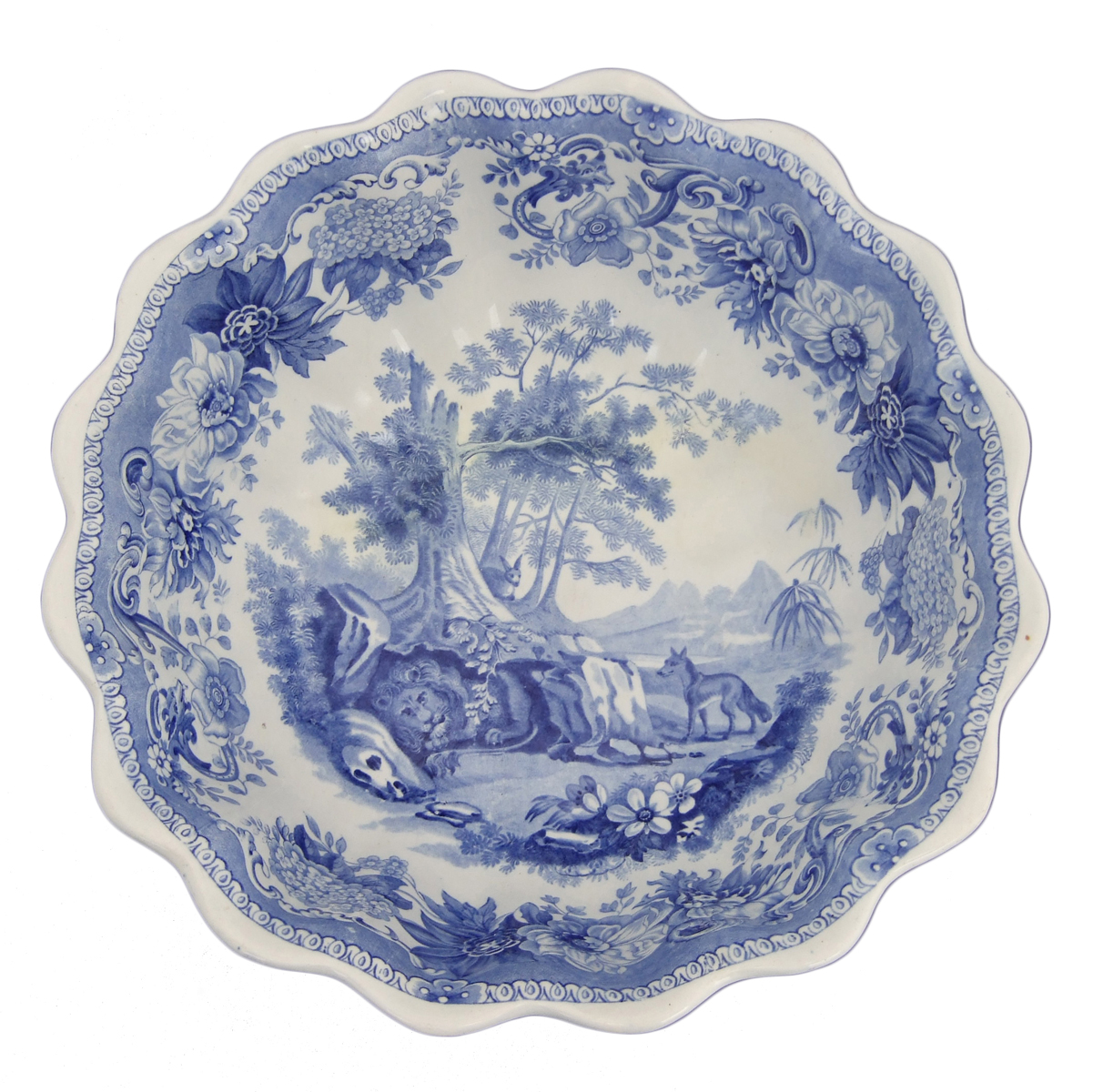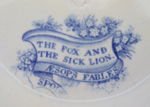 This pattern was printed in blue underglaze on an earthenware scalloped edge footed bowl interior. This pattern was introduced in c.1830. Below is the blue printed title mark and an image of the side view of the bowl which is printed with The Leopard and the Fox. Click on the image of the bowl to enlarge it.  Drakard/Holdway Pattern Number P907-7 Mark Types and IDsImpressed 4 Transfer Printed 64 Workman's Mark Transfer Printed WMT 11