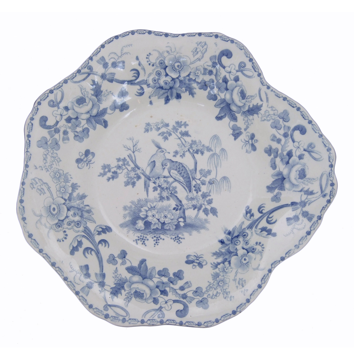 This pattern was printed in blue underglaze on a single-handled shaped earthenware dessert dish. The French Birds pattern was introduced in the late 1820's or early 1830's and was one of the first prints to be used with underglaze pink. Drakard/Holdway Pattern Number P718 Mark Types and IDsImpressed 4 Transfer Printed Unidentified Mark 1 Workman's Mark Transfer Printed WMT Unidentified Mark 1
