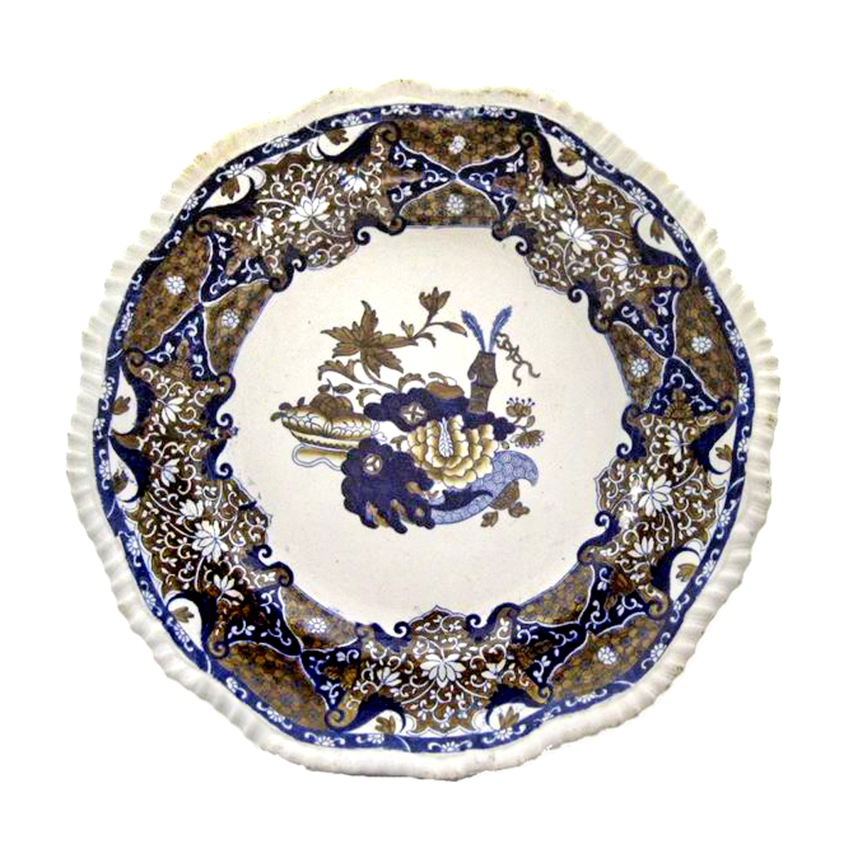 This pattern is shown on an earthenware dinner plate with gadrooned edge and is printed in blue with brown colored in underglaze. It is Spode B pattern number 113. The name may have originated as a factory name. If you look at the outside of the pattern you will see an unusual frog-like figure that seems to hang rather inexplicably from one of the leaves in the large vase. Frog was a popular pattern for Spode, and it was produced in a number of different color combinations. It was first made in 1821 and was still being produced in the Spode New Stone body in 1833, when Copeland & Garrett took over the Spode works. The Spode Museum Collection holds an example of this pattern on a plate with the caption in script on the back: "Used at the Coronation of His Majesty George the 4th - 19th July 1821." Mark Types and IDsImpressed 2a Transfer Printed 33