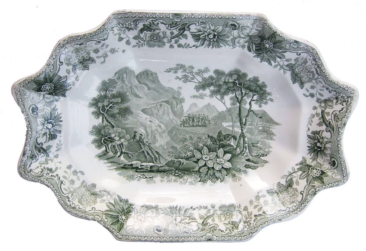 This rare pattern from the Aesop's Fables series was printed in green underglaze on an earthenware handled dessert dish. The printed mark is shown below. Drakard/Holdway Pattern Number P907-18 Mark Types and IDsTransfer Printed 64 The Mountains in Labour Green