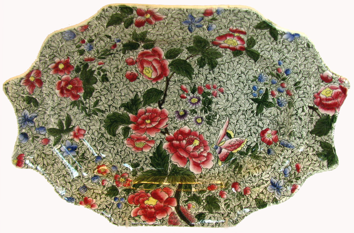 Shown on a handled earthenware dish, this chintz pattern is printed in green and colored in under the glaze. The rim is enameled in a soft yellow. It is c. 1827-1833. Mark Types and IDsTransfer Printed 33 Green