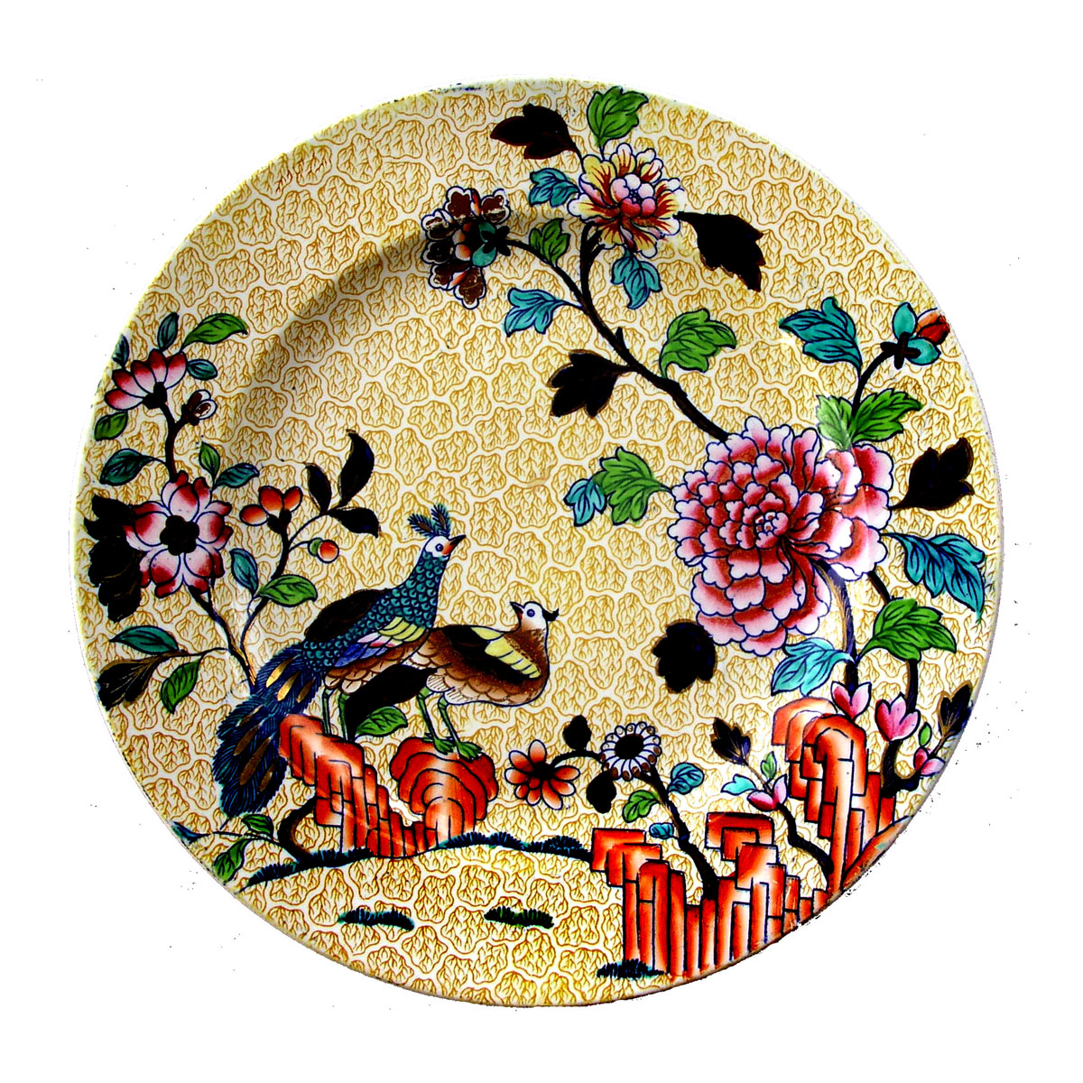 This pattern is shown here on a bone china dessert plate printed in blue and colored in underglaze with over the glaze gild decoration. Spode first produced this pattern on stoneware. The pattern was taken from an original Chinese export pattern. The Stone China pattern was recorded as number 2118. This example has a pattern number 4079 and is printed with a sheet pattern background known as Parsley. According to Robert Copeland, the Peacock pattern "is probably the best known Spode pattern on Stone china." The plate also has a painted pattern mark as shown here. Mark Types and IDsImpressed 4 Transfer Printed 34