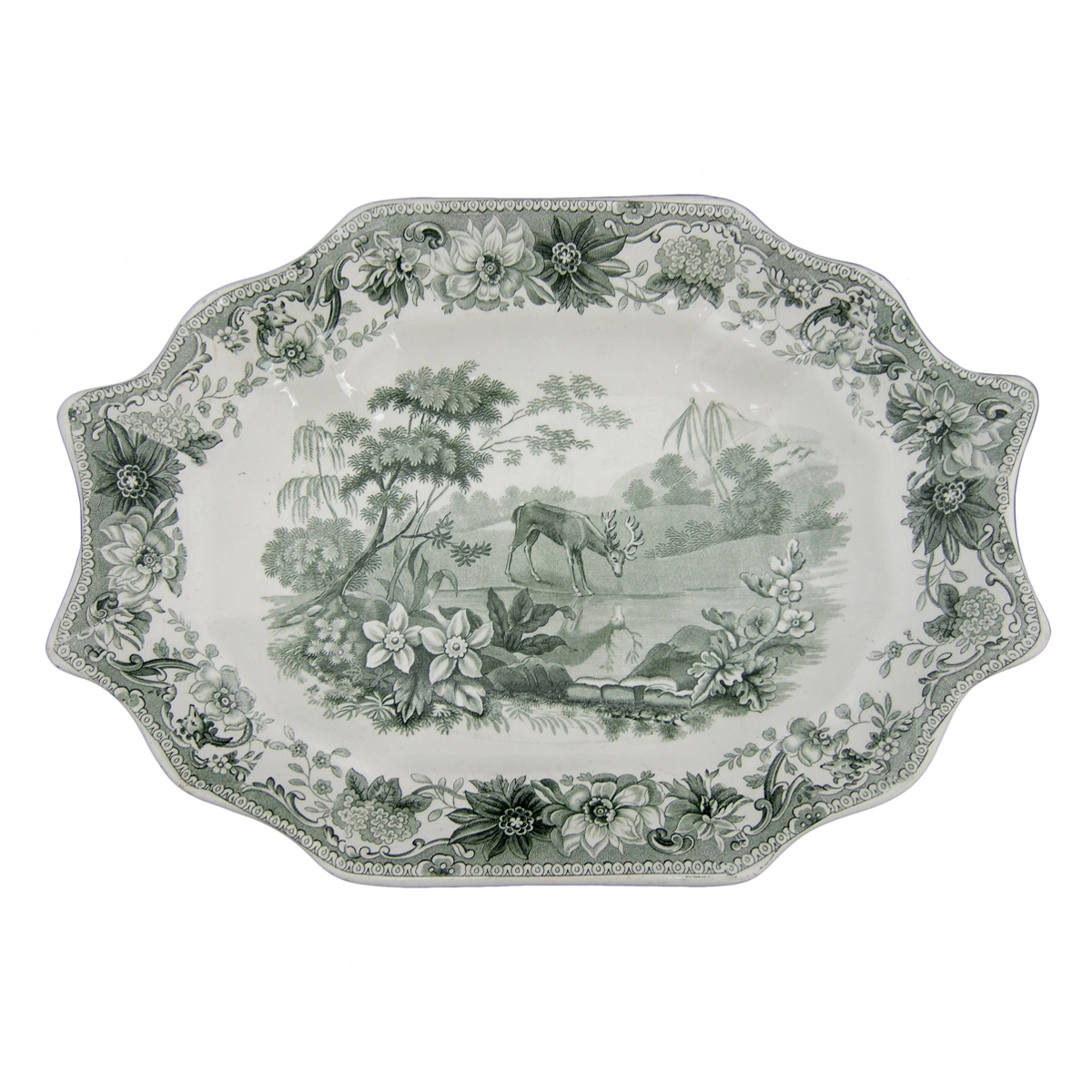 This pattern was printed in green underglaze on an earthenware shaped dessert dish. This pattern was introduced in c.1830.