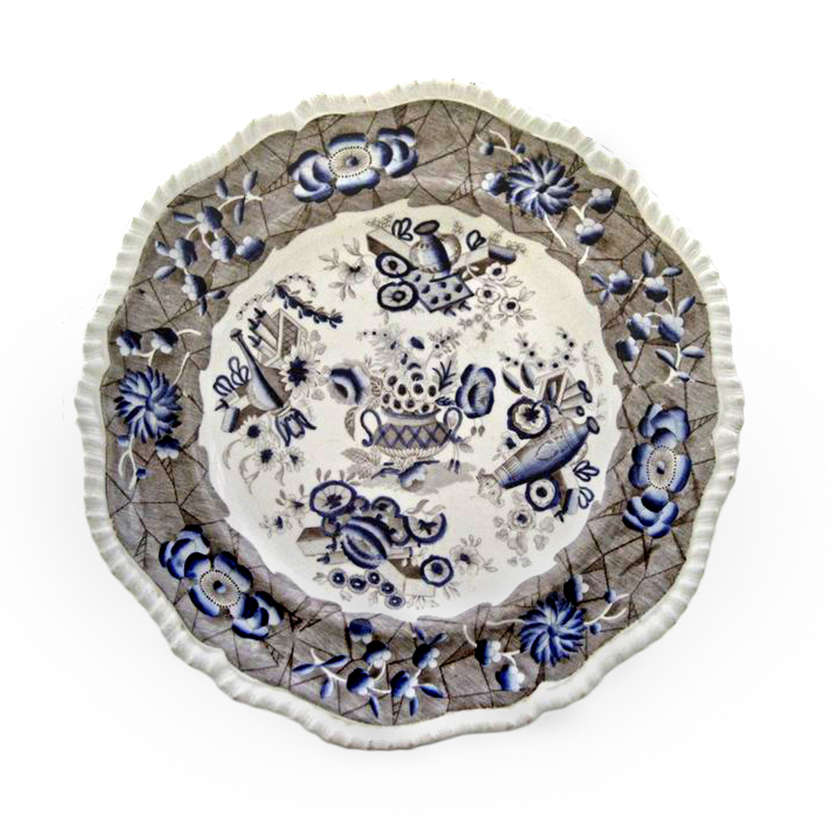 The pattern on this soup dish is another variation of the Trophies pattern and is printed in black underglaze with a gray ground for the marble border. Note that the pattern varies from the other pattern in this exhibition in that the center of this design consists of a large vase with flowers. The Four Treasures are represented by the symbols of the four fine arts: music, chess, calligraphy and painting. The border pattern in Trophies Marble is taken from the Marble pattern, also known as Mosaic or Cracked Ice and Prunus. Mark Types and IDsTransfer Printed 33 Black