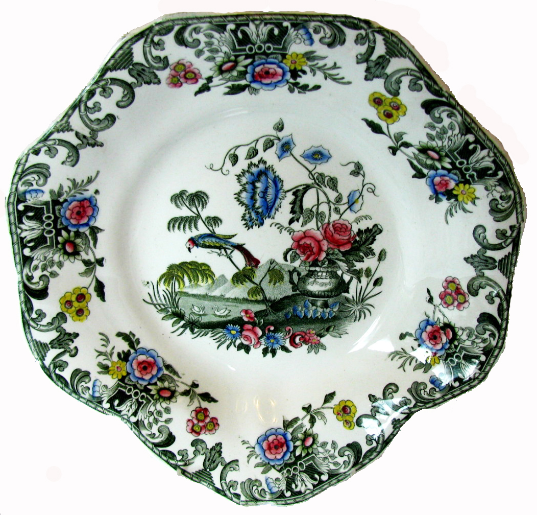 Printed in green on an earthenware handled dessert dish, this pattern is colored in under the glaze. The "B" pattern number is unknown. It is c. 1826-1833. The mark, shown below, is printed in green and is a slight variation of mark 51a.  Mark Types and IDsTransfer Printed