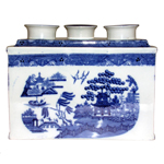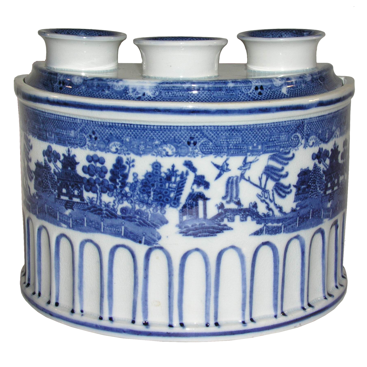 This early earthenware bowpot, or bough pot, was printed in blue underglaze in the Willow 1 pattern. The base and lower molded portion of the body were hand painted in blue underglaze to highlight its shape. While this example was without feet, examples are also known with padded feet. Shown below is the back side which is also printed. Click on it to enlarge it. Drakard/Holdway Pattern Number P609-1
