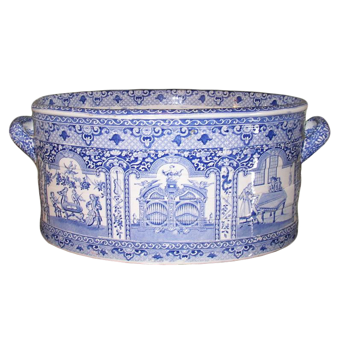 Exhibited here is an elaborately decorated earthenware footbath printed in blue underglaze in the Musicians pattern. The pattern that surrounds the footbath consists of selected vignettes of musical scenes in a village or rural setting. They were selected from the seven distinct patterns that make up the Musicians complete design: 1) villagers dancing to bagpipes, 2) villagers linking hands around a pole bearing six spheres which may be lanterns, 3) a woman singing while another accompanies on a spinet, 4) a couple standing before a church with spire, 5) a pipe organ, and 6) a string quartet playing from music on a circular table, and 7) four gentlemen drinking and smoking at a table accompanied by two fiddlers on a balcony. Spode printed these scenes in combination or individually on a variety of toilet wares and other useful objects. A hand bowl and extinguisher tray, or candle snuffer, are other examples also included in this exhibit. Drakard/Holdway Pattern Number P706 Mark Types and IDsTransfer Printed 31