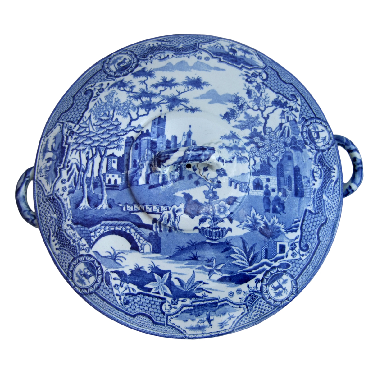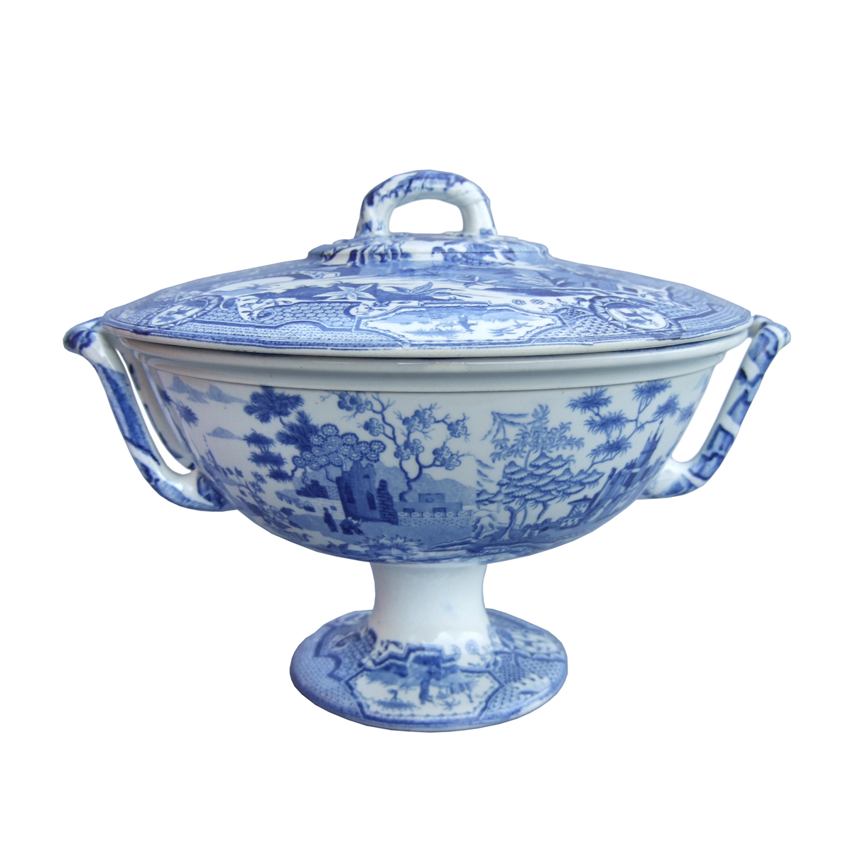 This handled comport is printed in blue underglaze in the Gothic Castle pattern. The pattern is an example of transitional Chinoiserie in which Chinese, European, and even African elements are incorporated into the central and border designs. The pattern was usually found on dinner wares. Shown below is a top view. Click on it to enlarge. Drakard/Holdway Pattern Number P708