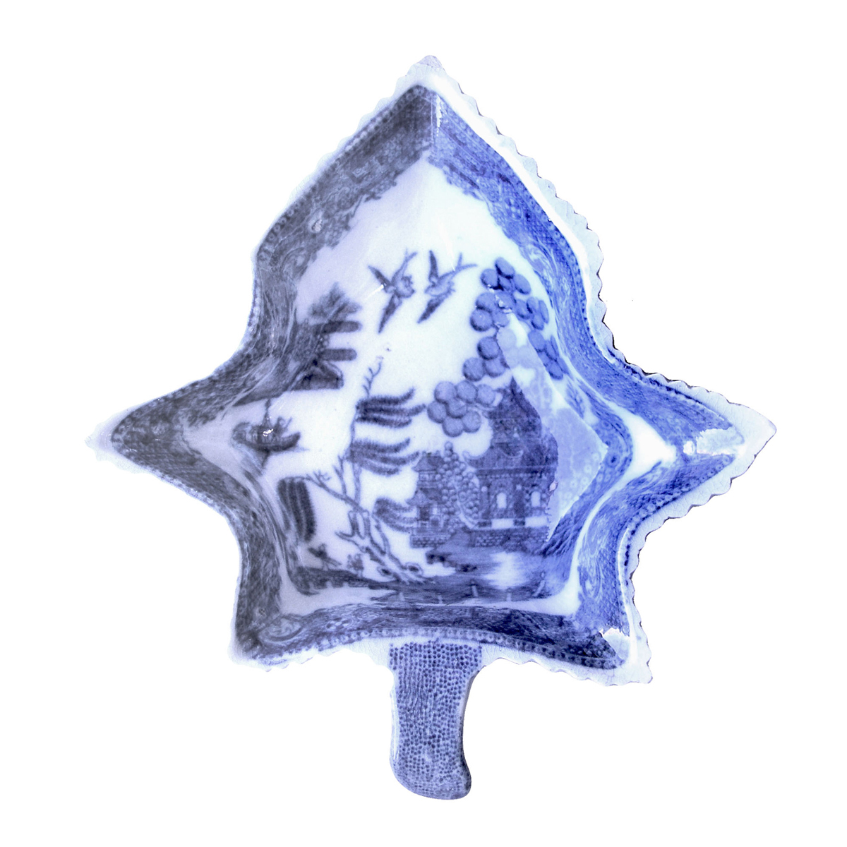 An earthenware leaf dish shaped and moulded with veins and stalks on the underside. Printed in blue underglaze in the Willow pattern. Drakard/Holdway Pattern Number P609-1 Mark Types and IDsWorkman's Mark Painted WMP 5 Version 3