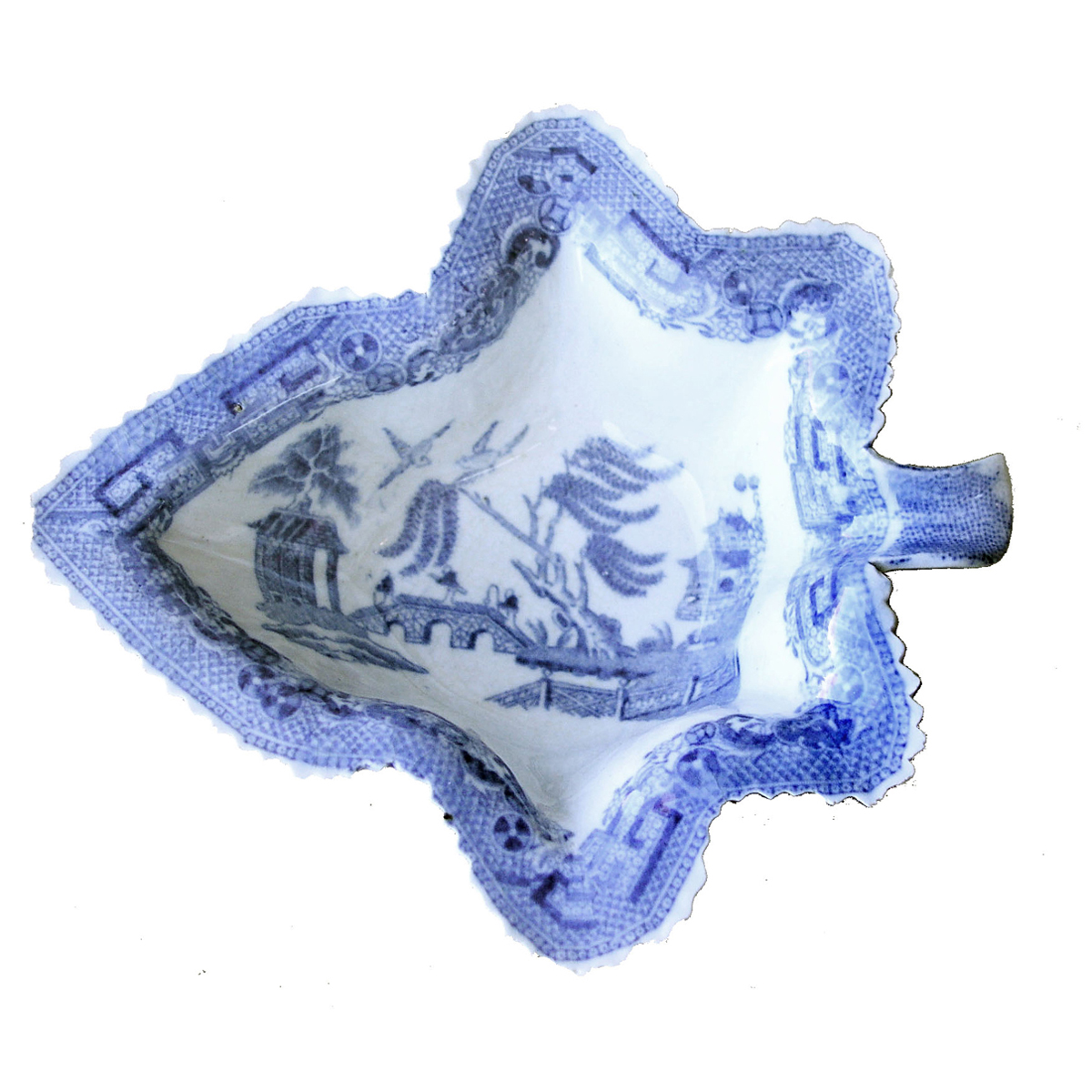 An earthenware leaf dish shaped and moulded with veins and stalks on the underside. Printed in medium blue underglaze in the Willow pattern. Drakard/Holdway Pattern Number P609-1 Mark Types and IDsTransfer Printed WMP 1 Workman's Mark Transfer Printed 33