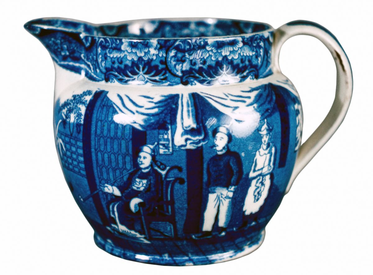 This low Dutch-shaped earthenware jug was printed in a very rare pattern known as "Chinese of Rank." The source for the design has been identified as an aquatint entitled "A Chinese of Rank" by Thomas and William Daniell in Picturesque Voyages to India by the way of China, London, 1810. Attribution of this pattern to Spode is made based on several copper engravings of this pattern retained in the Spode archives and an egg stand marked SPODE that is known. The pattern was also made by Miles Mason. This shape is found in the 1820 Shape Book. See the link to page 33 below. Drakard/Holdway Pattern Number P632 View Shape Book Page 33 »
