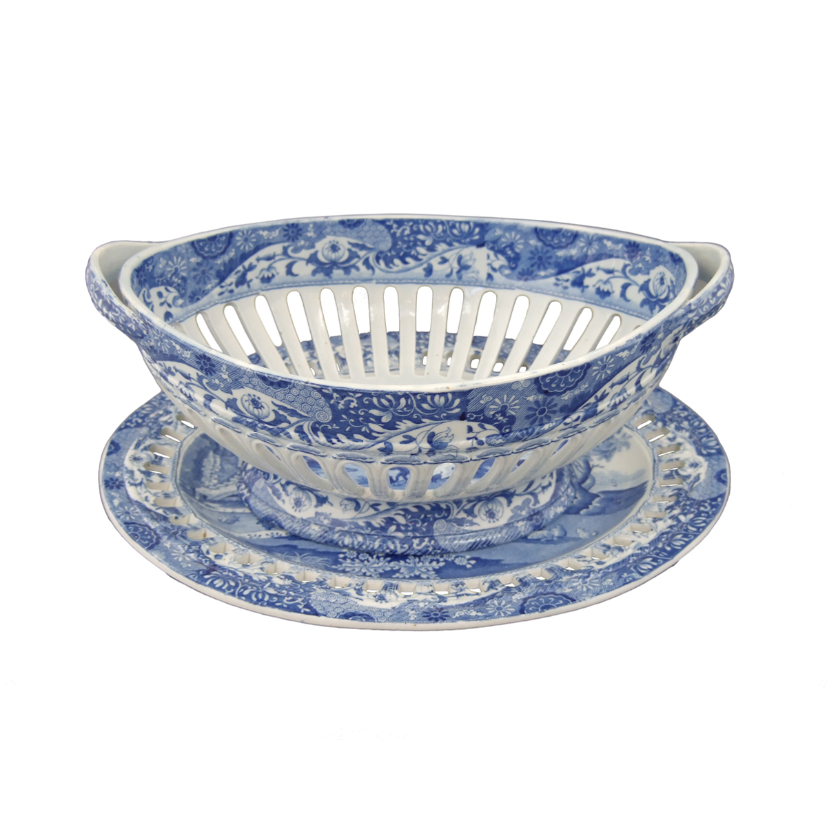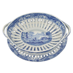 Spode's ever-popular Italian pattern is printed in underglaze blue on this pierced eathenware basket with accompanying pierced earthenware stand. With a border copied from a Chinese original and a center based on a Claude Lorraine pastoral landscape of 1638, these pieces comprise an imposing addition to any table. Note the attractive view when seen from above. Click on the image to enlarge it. Drakard/Holdway Pattern Number P710