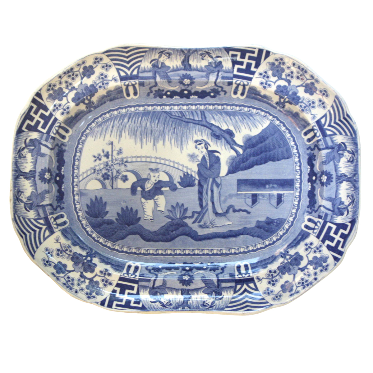 The pattern printed in blue underglaze on this indented earthenware platter is Lange Lijsen, also known as Long Eliza. Drakard/Holdway Pattern Number P622 Mark Types and IDsImpressed 33 Transfer Printed 2a