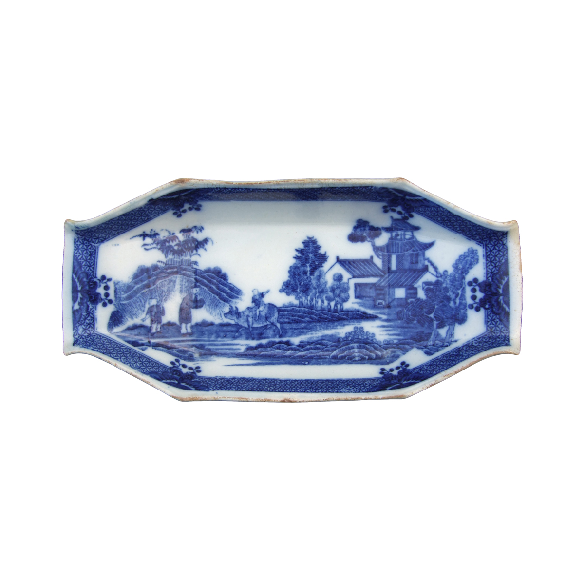 An earthenware root dish printed in blue underglaze in the Buffalo pattern. Drakard/Holdway Pattern Number P616