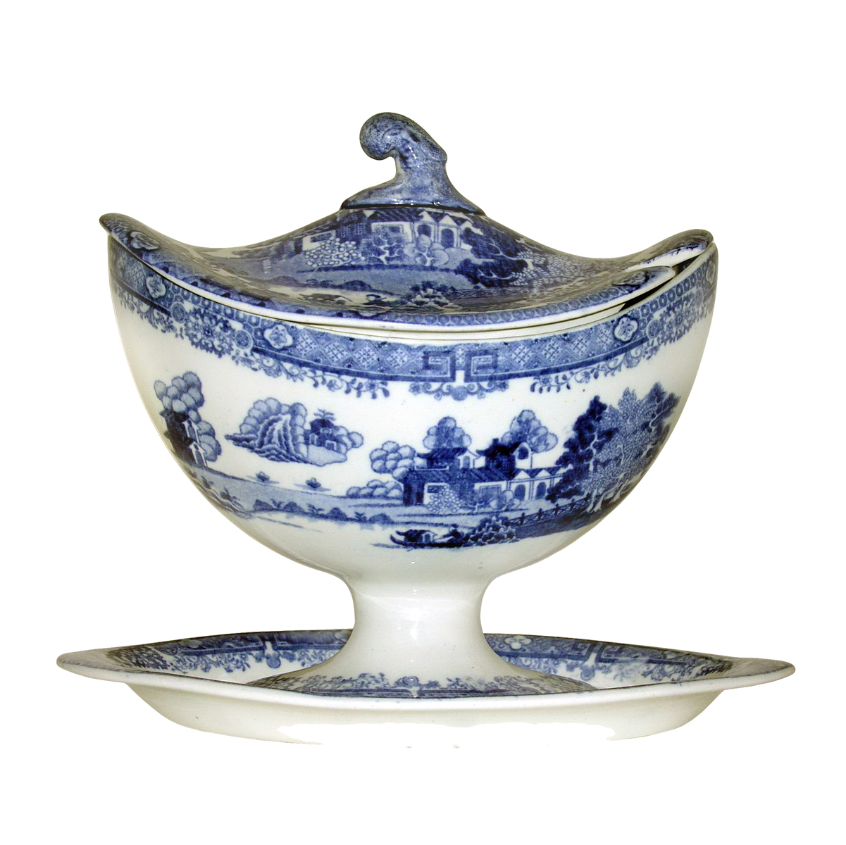 An earthenware sauce tureen, cover and stand printed in blue underglaze in the Forest Landscape II pattern. The tureen and stand were made as one piece. This example is missing the ladle. Drakard and Holdway note that this shape could have been used for a dessert service rather than a dinner service. Drakard/Holdway Pattern Number P607 Mark Types and IDsWorkman's Mark Transfer Printed WMT 33