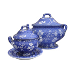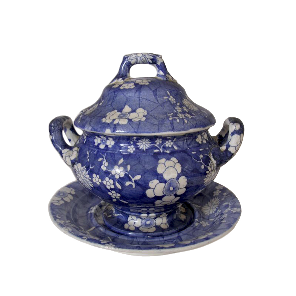 This earthenware sauce tureen and stand are printed in blue underglaze in the Cracked Ice and Prunus pattern, also referred to as Marble or Mosaic. Shown below is this tureen with the companion soup tureen. Click on it to enlarge. Drakard/Holdway Pattern Number P807 Mark Types and IDsImpressed 4 Transfer Printed 34