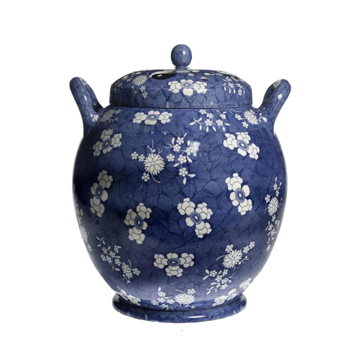 A barrel-shaped earthenware scent jar with perforated cover printed in blue underglaze in the Cracked Ice and Prunus pattern, also referred to as Marble or Mosaic. Drakard/Holdway Pattern Number P807 View Shape Book Page 40 »