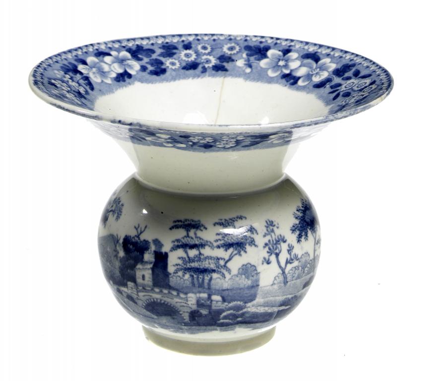 This rare earthenware trumpet-mouthed spitting pot was printed in blue underglaze in the Tower pattern and is c.1820.  Drakard/Holdway Pattern Number P714 Mark Types and IDsTransfer Printed 31