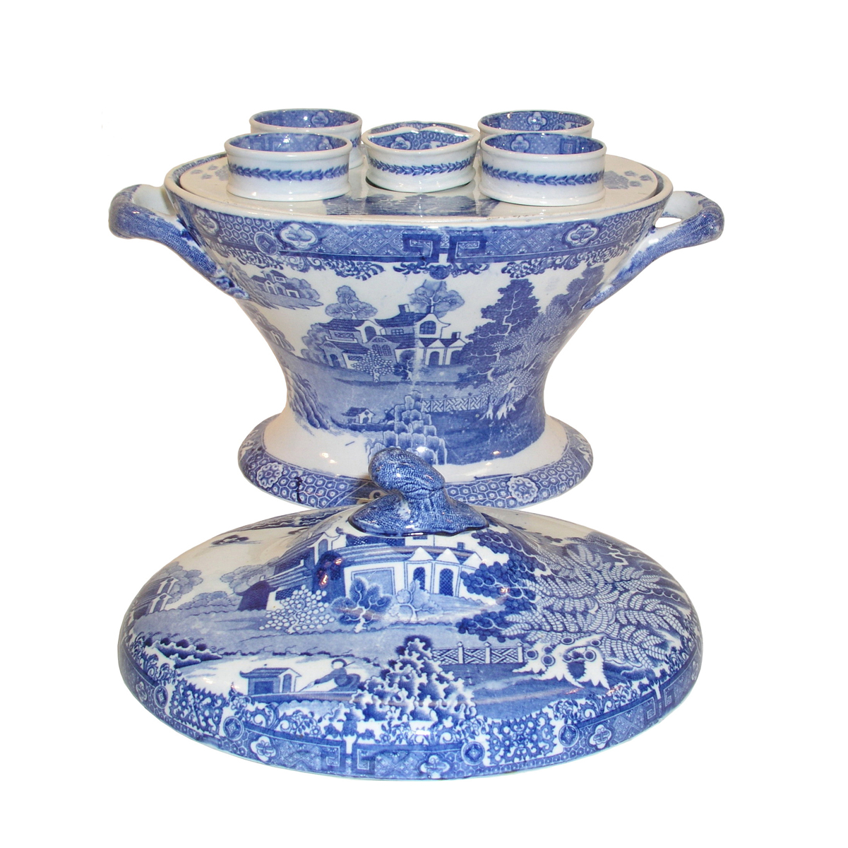 This earthenware center supper dish is printed in medium blue underglaze in the Forest Landscape II pattern. The dish, intended to be part of a complete supper set, consists of a raised center piece with an inner removable bowl, an pierced egg cup tray holding four frame egg cups and a divided container for salt and pepper along with a cover. Drakard/Holdway Pattern Number P607-3 Mark Types and IDsWorkman's Mark Painted WMP 33