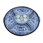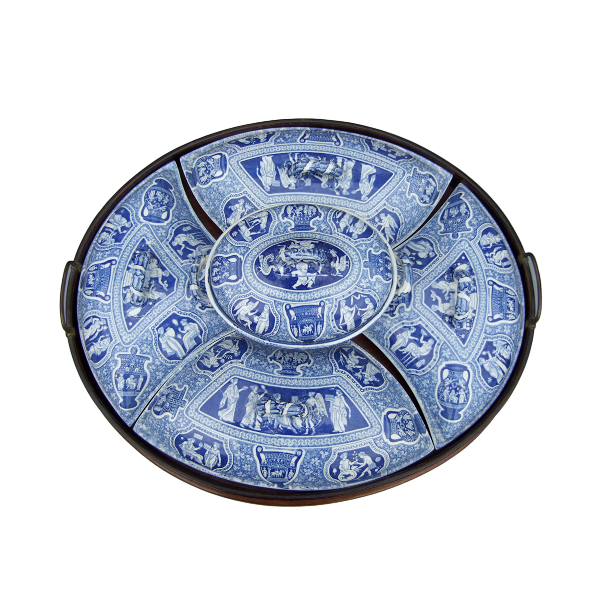 This pattern is printed in blue underglaze on an earthenware complete supper set. The Greek pattern consists of three elements; the "vases" in the border, the "central" prints (this is where the titles are derived) and the "panels" in the border. Pieces without "central" prints have no actual pattern name, but are decorated with unique "panels". These tend to be shapes that didn't lend themselves to being printed with a central design, such as small items or hollow wares. These pieces and patterns are to be listed purely in the shapes section as they have no pattern title. Below is another view of the piece. Click on it to enlarge.