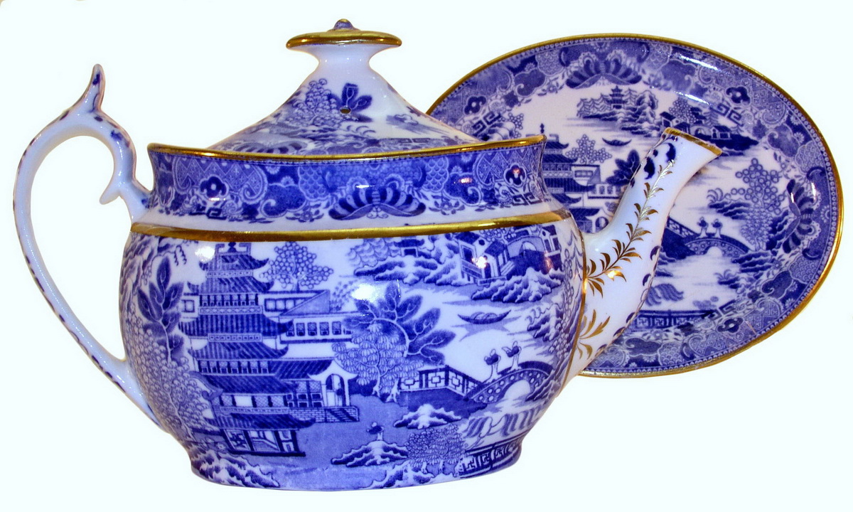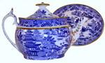 Shown here are five pieces of a bone china New Oval tea service, consisting of a covered sugar, teapot and stand, cream jug, and waste bowl, printed in vivid blue underglaze in the Two Temples I pattern. Shown below is the New Oval teapot and stand. Click on it to enlarge. Drakard/Holdway Pattern Number P613-1 Mark Types and IDsTransfer Printed 33