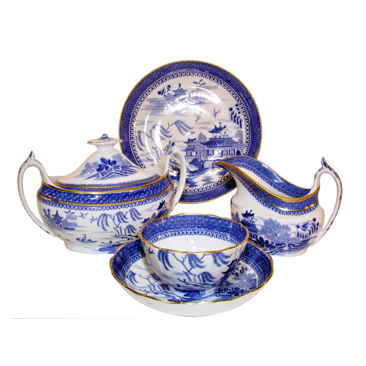 This New Oval bone china partial tea service, complete except for the teapot, stand, and waste bowl, is printed in blue underglaze in the Mandarin pattern with dagger border. Gild decoration has been added. Representative pieces shown here include a covered sugar box with handles, a tea or biscuit plate, a teabowl, saucer, and cream jug. The cup and saucer have scalloped rims. Drakard/Holdway Pattern Number P605-2 Mark Types and IDsTransfer Printed 31