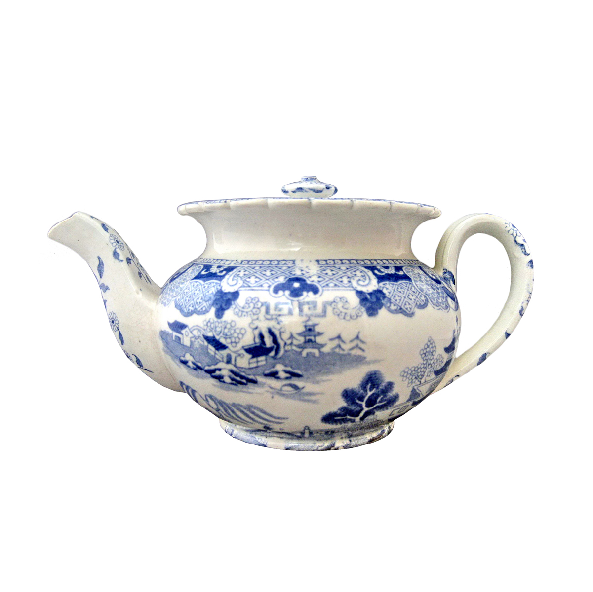 An earthneware toy teapot printed in medium blue underglaze in the Broseley, Reversed pattern. It has a curved and scalloped collar. Drakard/Holdway Pattern Number P614-2 Mark Types and IDsImpressed 33 Workman's Mark Transfer Printed WMT 28