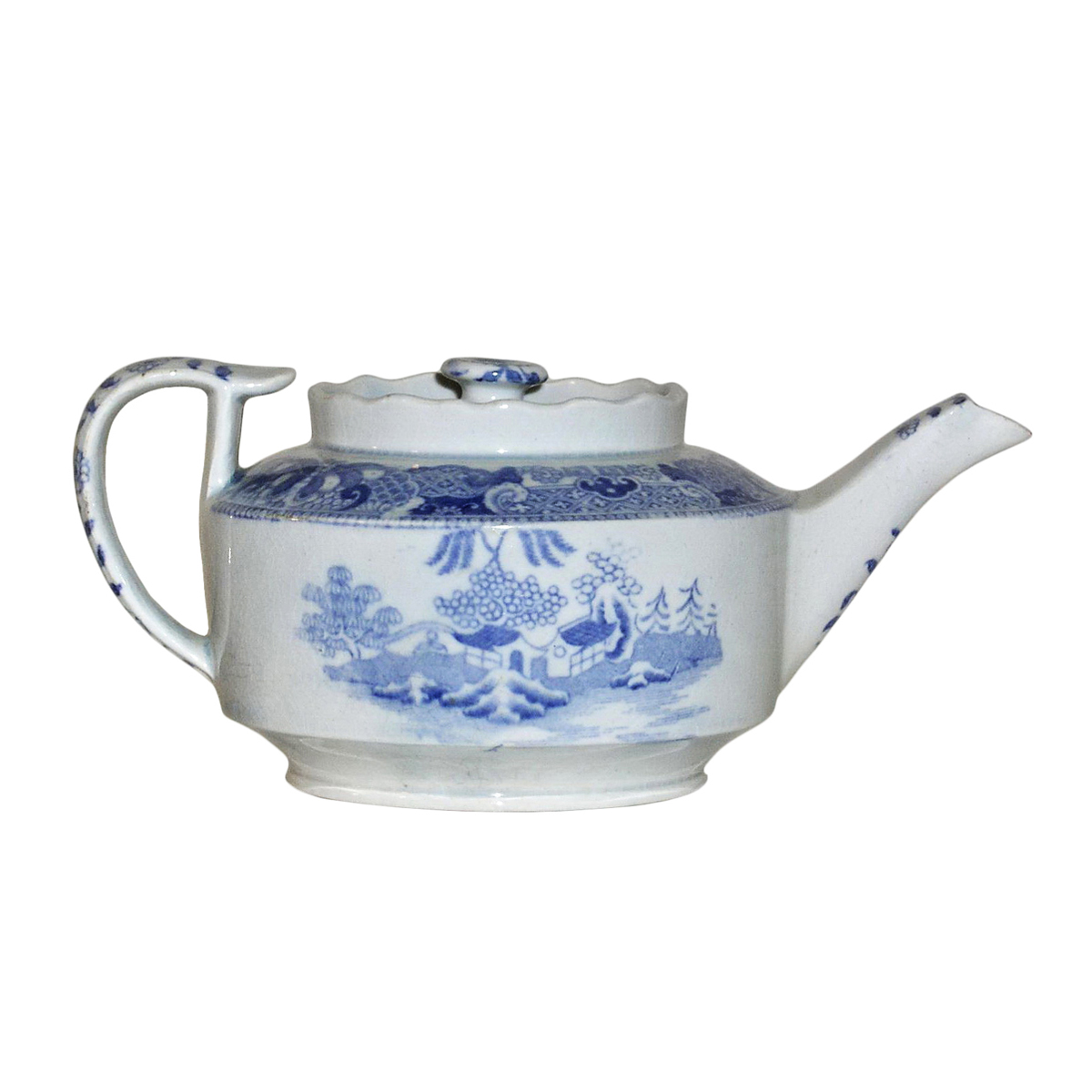 An earthenware toy teapot with scalloped collar printed in medium blue underglaze in the Broseley, Reversed pattern. Mark Types and IDsTransfer Printed 33 Workman's Mark Transfer Printed Unidentified Mark 5