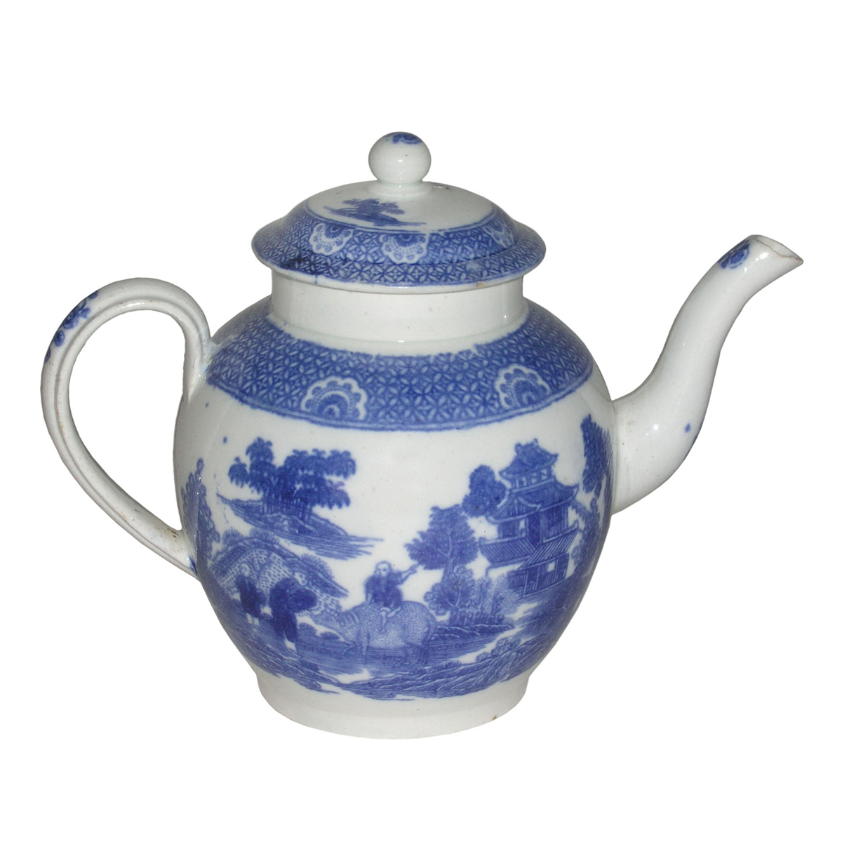 This small early child's earthenware teapot, ovoid shape, was printed in medium blue underglaze in the Buffalo pattern. Drakard/Holdway Pattern Number P616 Mark Types and IDsWorkman's Mark Painted WMP 16 Version 2