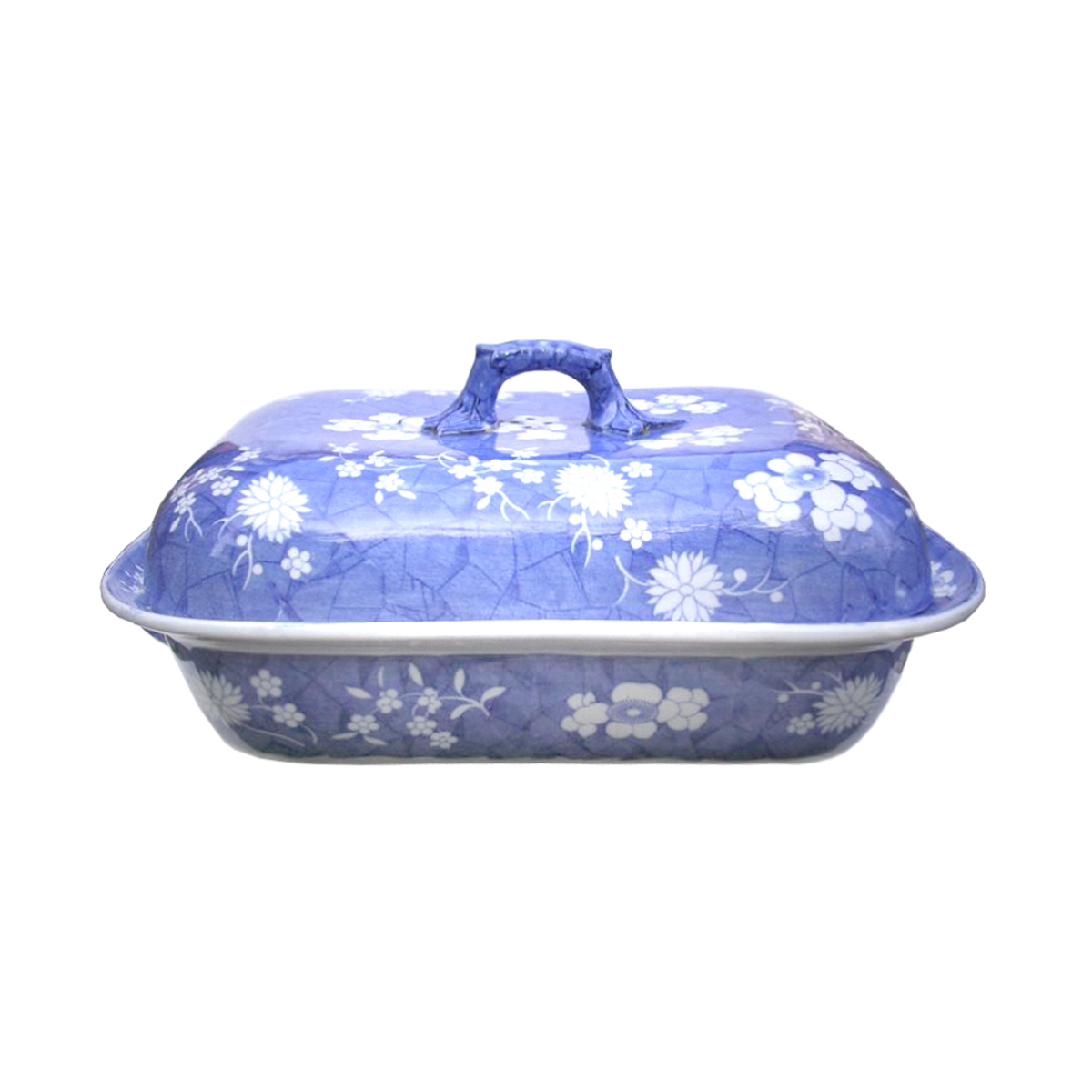 An earthenware covered vegetable tureen printed in blue underglaze in the Cracked Ice and Prunus pattern, also referred to as Marble or Mosaic. Shown below is a side view of this shape. Click on it to enlarge. Drakard/Holdway Pattern Number P807 Mark Types and IDsImpressed 4 Transfer Printed 34