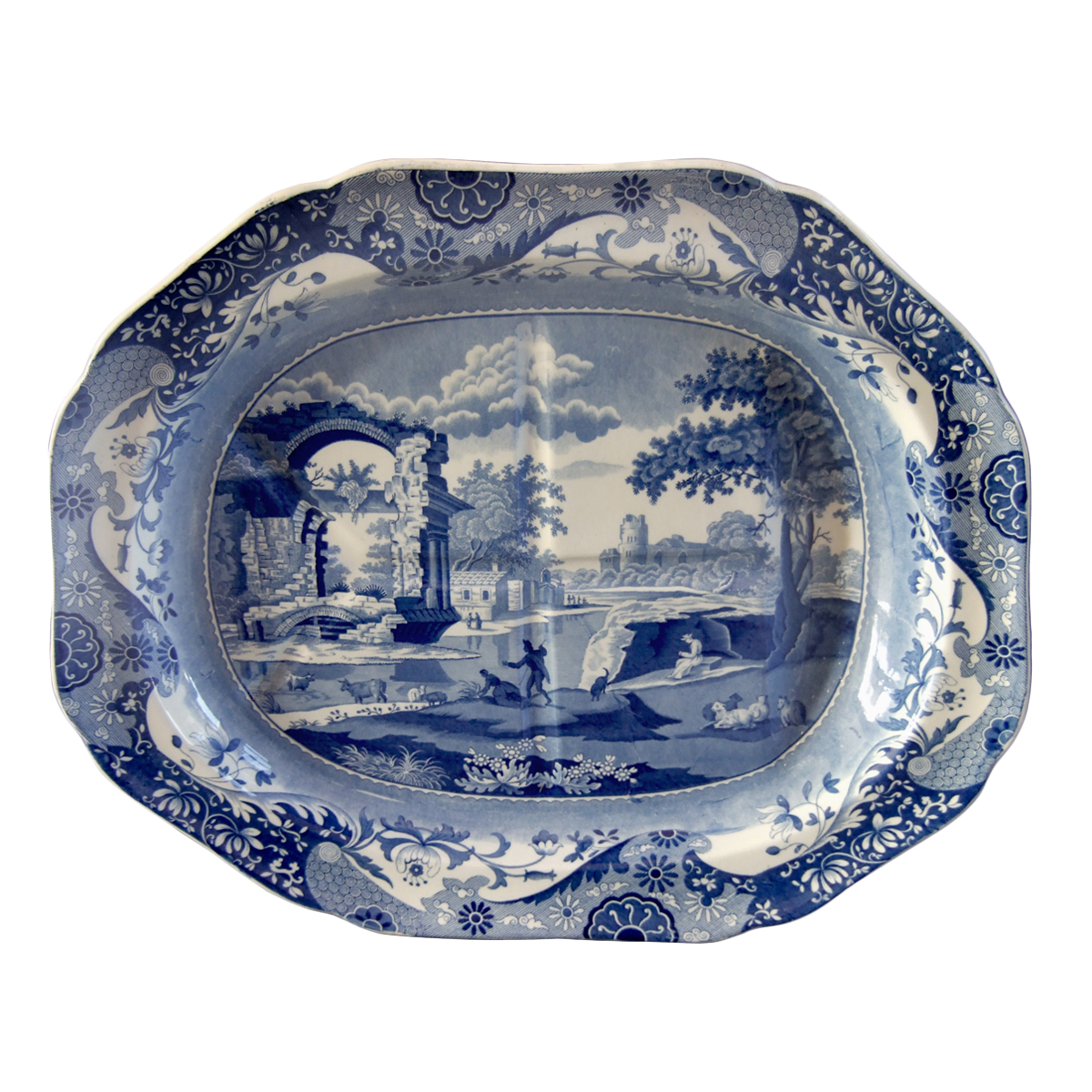 This large platter is printed in underglaze blue with one of Spode's most popular patterns, known as Italian. A Claude Lorraine pastoral landscape painting (c. 1638) was the inspiration for the center scene, and an original Chinese design was used for the border. Printed on the back side of the platter is Spode's transfer-printed label that promotes the fact that the company applied the principle of using only native English cobalt. Robert Copeland found that, later, Spode removed "Wheal" from the mark as it meant the same as "Mine" in Cornwall. The mark is shown below.  Drakard/Holdway Pattern Number P710 Mark Types and IDsImpressed 3a Transfer Printed 65a