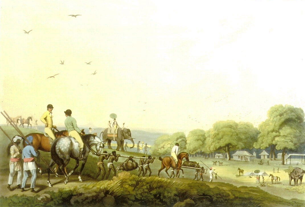 The elephant in the center of this aquatint, plate 7 in Oriental Field Sports, was the source for the elephant pictured in the border of the Caramanian series. |