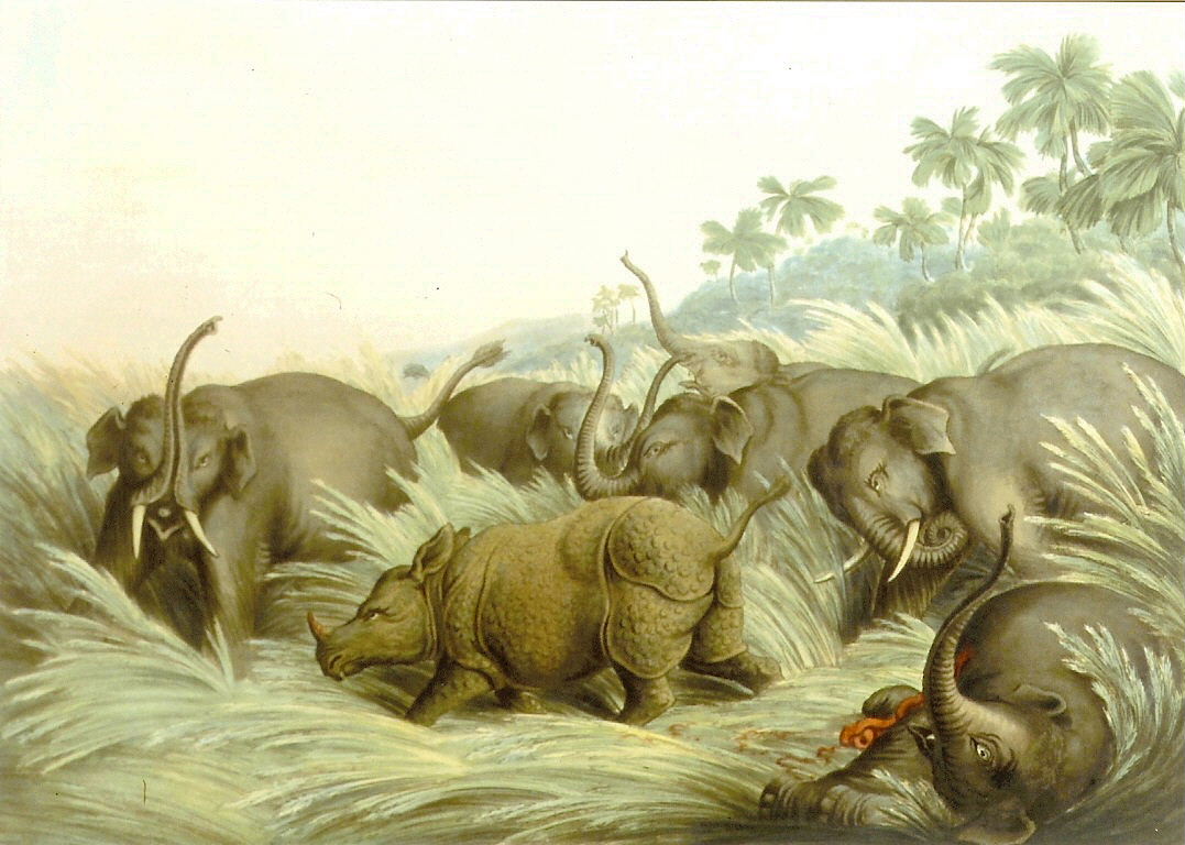This aquatint, approximately 12 x 9 inches, was the source for the image of the rhinoceros in the Caramanian series border. |